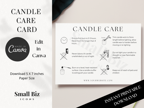 Use this minimal Candle Care Card to help your customers get the most out of their candles and tell them about the best safety practices to follow. Customise the font, colours and text when you create a FREE Canva account and edit your template straight away.